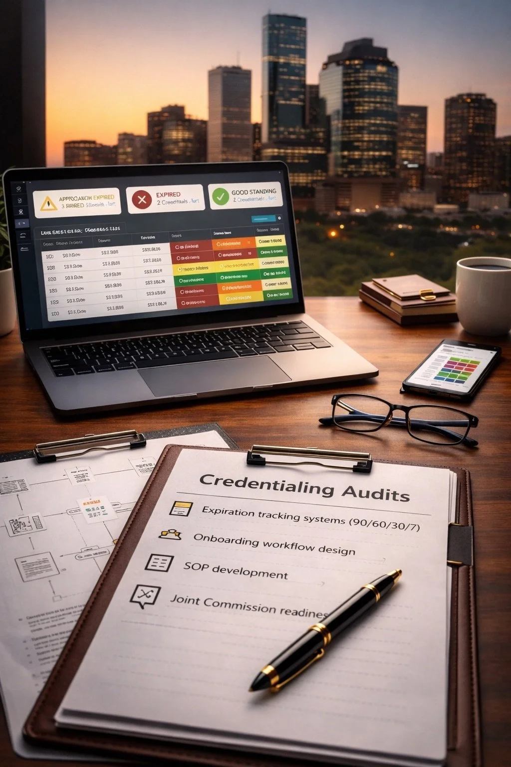 Credential tracker, onboarding workflow, file structure, 90/60/30/7-day alert process, SOP documentation.